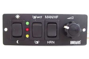 - 3 tlačidlá: denná / nočná prevádzka, maják / siréna, MANUAL / HORN