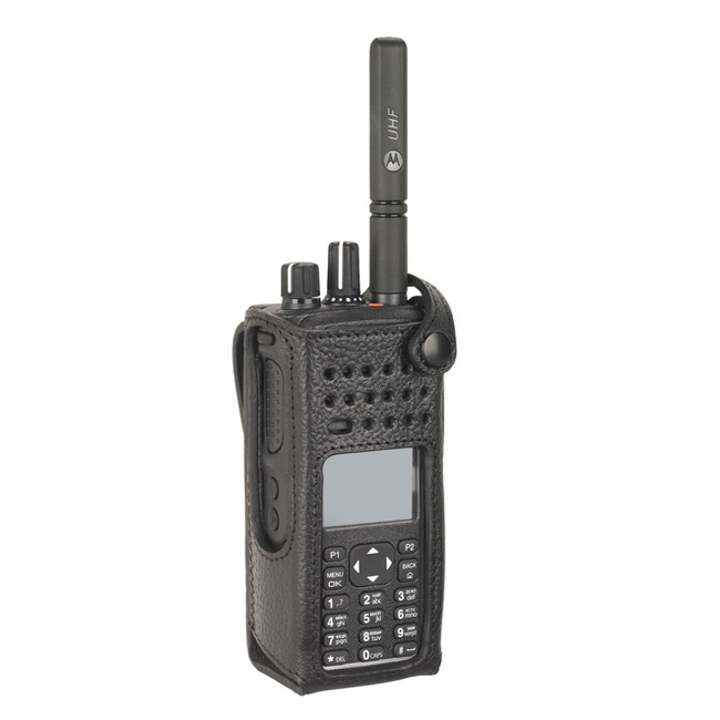 Prevedenie puzdra PMLN5838A - tvrdá pevná koža farbená na čierno. V puzdre sú vykonané všetky otvory pre prístup k všetkým ovládacím prvkom rádiostanice Motorola DP480x, alebo tiež Motorla DP 460x.