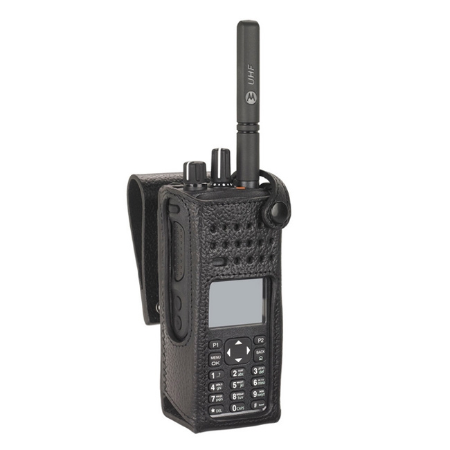 Prevedenie puzdra PMLN5842A - tvrdá pevná koža farbená na čierno. V puzdre sú vykonané všetky otvory pre prístup k všetkým ovládacím prvkom rádiostanice Motorola DP480x, alebo tiež Motorla DP 460x.
