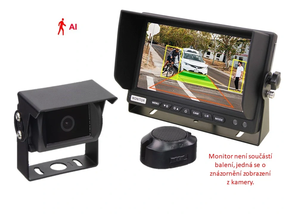 AHD kamera, vonkajšia, určená na montáž predovšetkým na nákladné vozidlá, autobusy, karavany či dodávky. Prepojenie 4-PINovým káblom. Kamera zároveň zobrazuje pomocné trajektórie pre parkovanie + detekuje pohyb osôb a pevných prekážok s obrazovým a zvukovým upozornením.