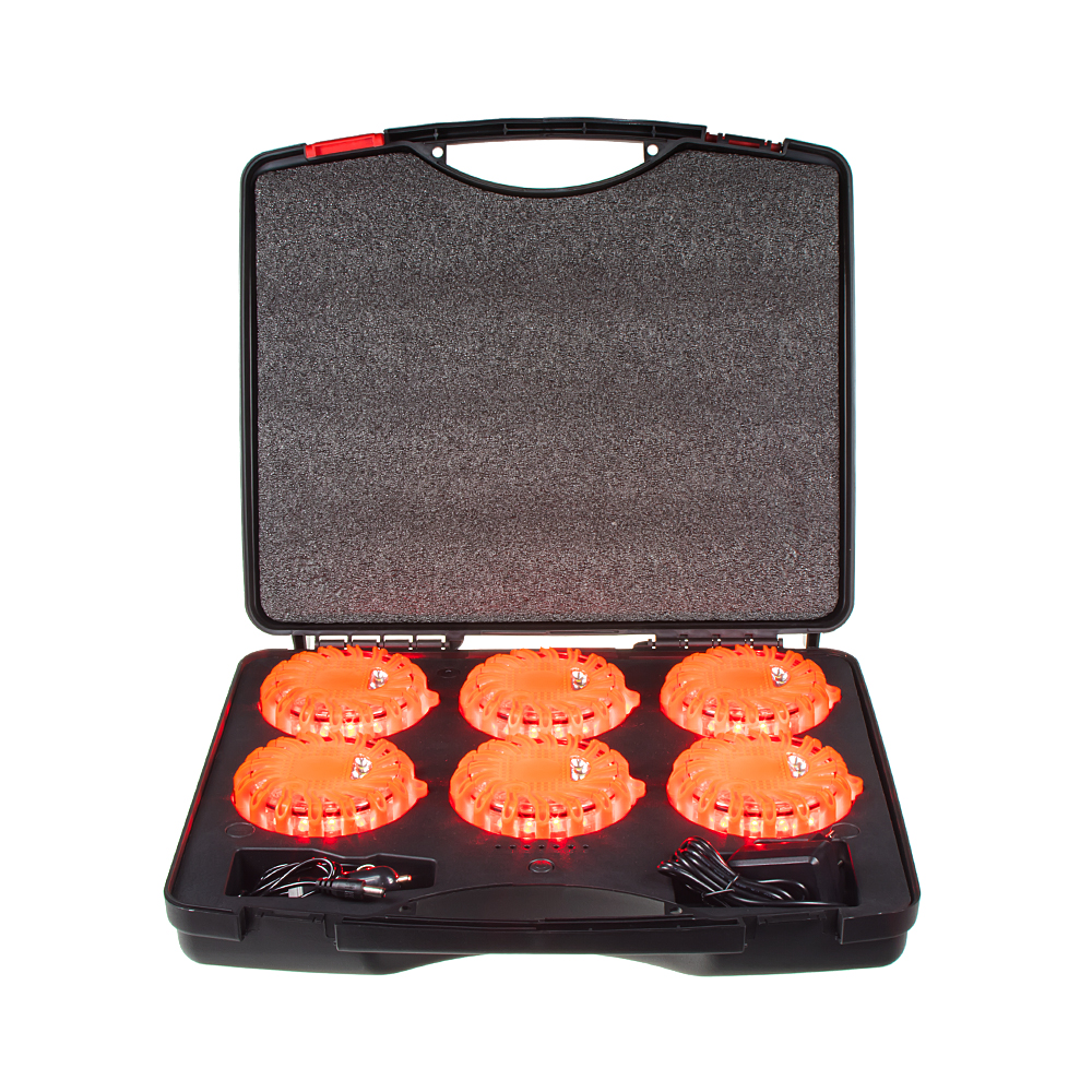 Set 6 LED prídavných červených výstražných svetiel s magnetom vo vodotesnom nárazuvzdornom obale, uložené v kompaktnom kufríku.Set vhodný na zvýraznenie miesta/prekážky, vhodné pre záchranné zložky.